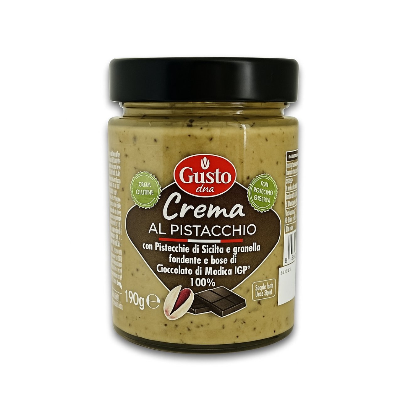 GUSTO ETNA pistāciju krēms ar Sicīlijas pistācijām un tumšās šokolādes graudiņiem 190g. Alergēni: satur PISTĀCIJAS. Var saturēt MANDEĻU un LAZDU RIEKSTU daļiņas. Sastāvdaļas: Krēms (cukurs, eļļa un augu tauki (eļļas (saulespuķu), tauki (palmu, palmu kodoli)), vājpiena pulveris (10%), sūkalu pulveris, emulgators (E322 saulespuķu lecitīns), aromatizētājs (vanilīns), dabīgās pistācijas 28%, sicīliešu pistācijas 7%, tumšās šokolādes graudi. Uzturvērtība uz 100g: enerģētiskā vertība 2423 kJ / 582 kcal; tauki 40g, no kuriem piesātinatās taukskābes 14g; ogļhidrāti 47g, no kuriem cukurs 45g; olbaltumvielas 7,3g; sāls 0,137g. Ieteicams līdz: skatīt uz iepakojuma. Uzglabāt sausā un vēsā vietā. Ražotājs: I VERI SAPORI DELL’ETNA Srl, Itālija. Pārdevējs: Moop Sia, Dzirnavu 45, Rīga, Latvija