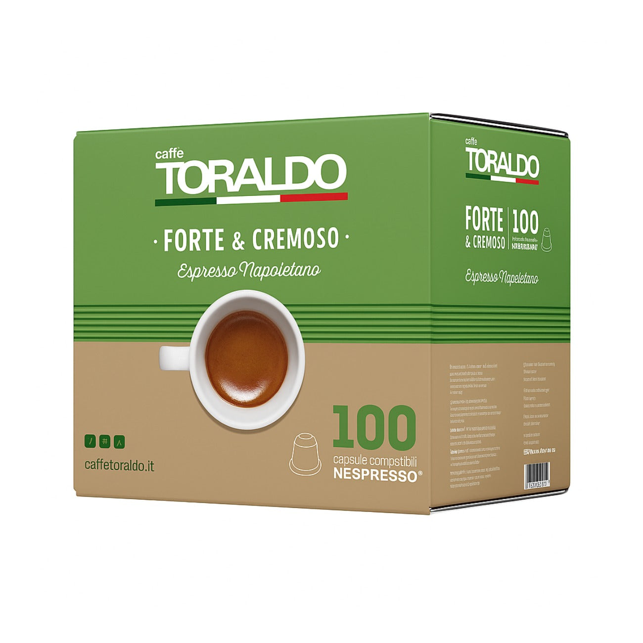 TORALDO Forte & Cremoso kafijas kapsulas, 100 kapsulas. Ideāli piemērotas NESPRESSO kafijas automātiem. Neto svars: 210g. Ieteicams līdz: skatīt uz iepakojuma. Uzglabāt sausā un vēsā vietā. Ražotājs: T. Corporation s.r.l., Itālija. Izplatītājs: Moop Sia, Dzirnavu 45, Rīga, Latvija, info@moop.lv