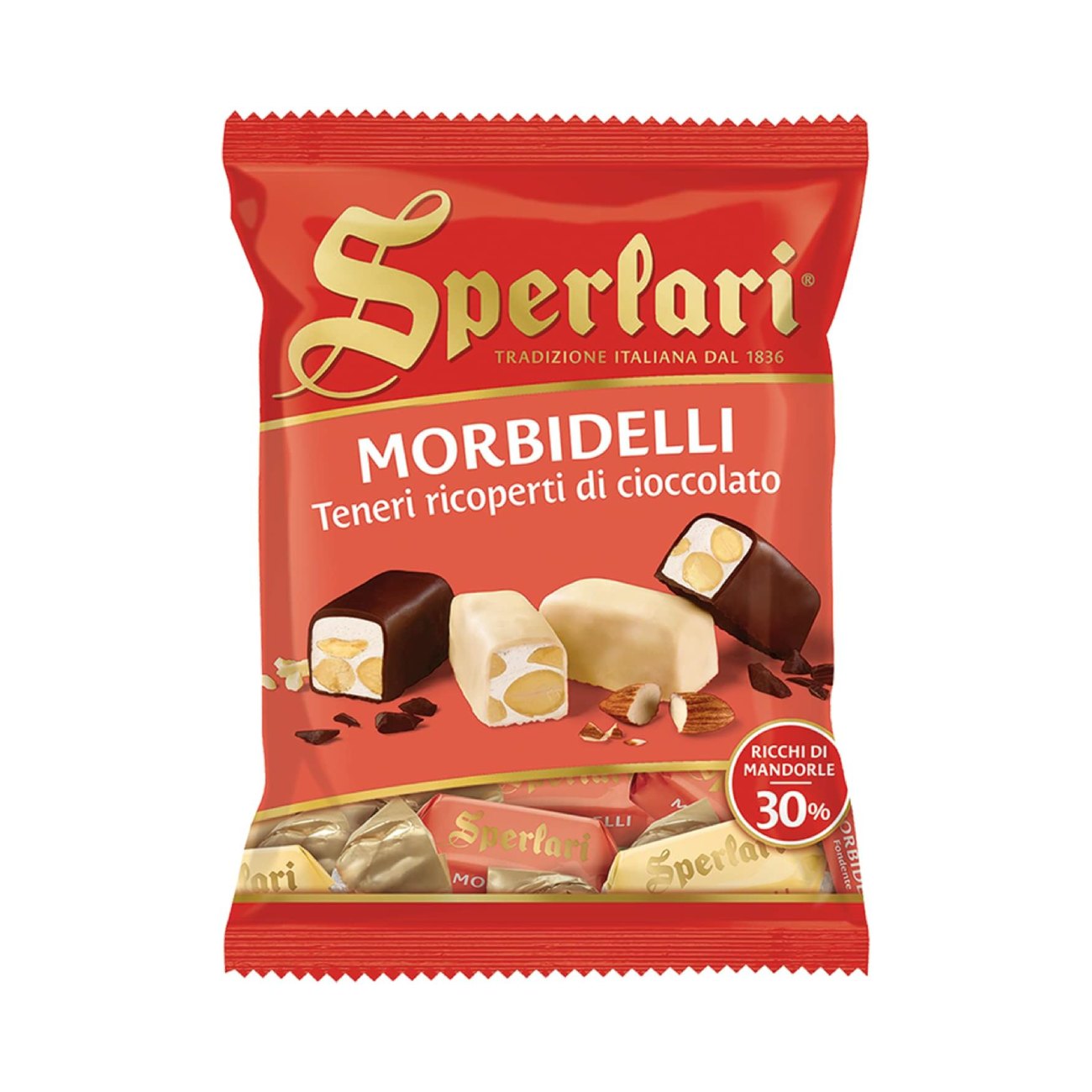 - SPERLARI soft nougat with almonds, covered with dark or white chocolate